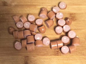 ![]() ③ソーセージは、1.5cm幅くらいの輪切りにしましょう。 |