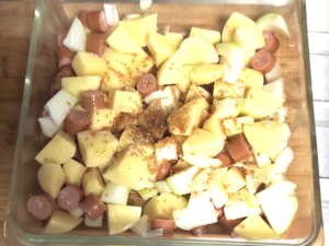 ![]() ④レンジで使える耐熱容器(今回はイワキのケーキ型を使いました)に、切った野菜とソーセージ、コンソメ、サラダ油、塩、黒コショウを入れて、よく混ぜ合わせます。 |