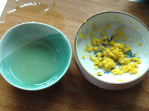 ![]() ①柚子は皮をすりおろし、果汁も絞っておきます。 |