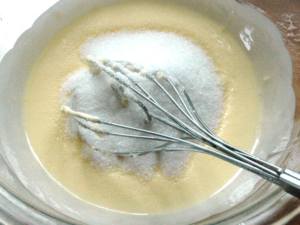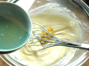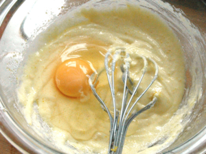 ![]() ⑤卵を一個ずつ加え、その都度良く混ぜましょう。 (室温に戻した卵でないと、分離しますので注意!) |