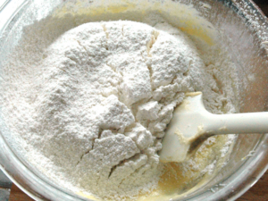 ![]() ⑥薄力粉とBPを一緒に振るった物を加え、ゴムべらで練らないようにさっくりと混ぜます。 |