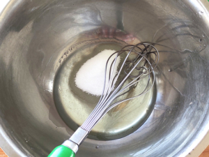 ![]() ③ボールにサラダ油と砂糖を入れ、砂糖のざらざら感が消え、白っぽくなるまですり混ぜましょう。 |
