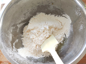 ![]() ⑤薄力粉、片栗粉、ベーキングパウダーを合わせてふるい入れ、ゴムベラに持ち替えて、さっくりと混ぜます。 (モロモロになったらOKです。) |