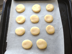 ![]() ⑥天板にオーブンシートを敷き、生地を一つ手に取り、丸くしてから手で軽く押さえて、5cmくらいの円になるように整形します。 ⑦オーブンシートの上に、少し間隔をあけて並べましょう。 |