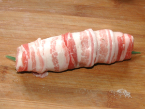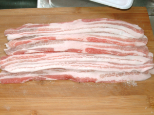![]() ①まな板の上に、スライス肉をちょっと重なるようにして並べます。 (シート状になるようにします。) ②肉に軽く塩コショウをしておきましょう。 |
