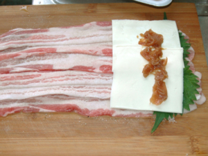 ![]() ③肉の右端(巻き始め)に、シソを3枚置き、その上にチーズ2枚、梅干しの半量の順に乗せます。 (チーズはスライスチーズを、梅干しは種を取って叩いて下さい。) |
