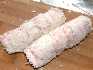 ![]() ⑥パン粉もまた、転がすようにして、しっかりと側面にもまぶしましょう。 |