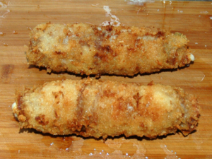 衣を付ける時には、側面にも衣を付けると、油で揚げた時にはみ出しません。