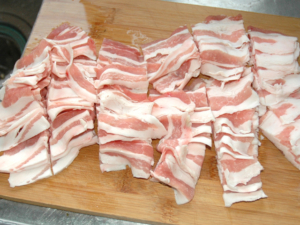 ![]() ①豚バラ肉を食べやすい長さに切ります。 |