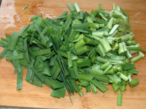 ![]() ②にらは根元を良く洗い、5cm幅くらいに切ります。 |