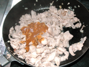 ![]() ⑤フライパンに油をひき、弱火で、にんにくと生姜を香りが出るまで炒めます。 ⑥豚肉を加え、白っぽく完全に火が通るまで炒め、完全に火が通ったら、調味料を合わせたものを加え、全体に絡めましょう。 |