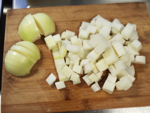 ![]() ①玉ねぎは皮をむき、くし形切りに、大根は皮をむき、2cm角に切ります。 |