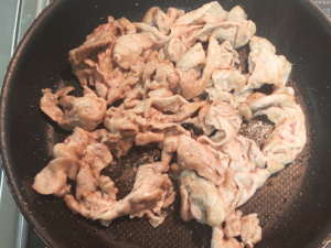 ![]() ⑤フライパンに薄く油(分量外)を引き、豚肉が白くなるまでしっかりと火を通しましょう。 |