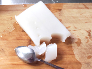 ![]() ①こんにゃくは、スプーンで一口大にちぎります。 (包丁で切るよりも、味が染みやすくなります。) |
