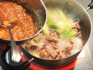 ![]() ⑤鍋が煮立ったら、合わせておいた調味料を加えてよく混ぜます。 |