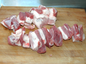 ![]() ①豚肉は、1.5cmほどの厚切りにします。 |