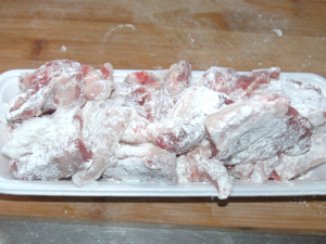 ![]() ②豚肉にまんべんなく、薄力粉をまぶしておきましょう。 |