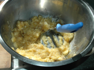 ![]() ②残ったバナナ全部をボールに入れ、マッシャーなどで細かくつぶします。 |