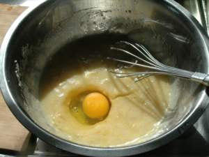![]() ⑤卵を1個ずつ加え、その都度良く混ぜます。 |