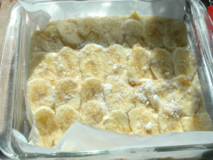 ![]() ⑧ケーキ型にオーブンシートを敷いたら、生地を流しいれます。 ⑨上に薄切りのバナナを並べ、グラニュー糖(分量外)を大1~2程ふりかけましょう。 |