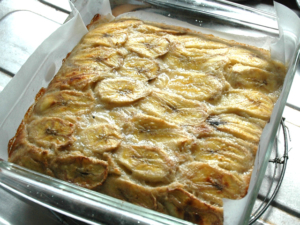 ![]() ⑩焼けたら、粗熱が取れるまで放置し、冷めたら、シートを外して切り分けます。 |