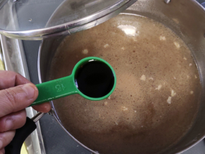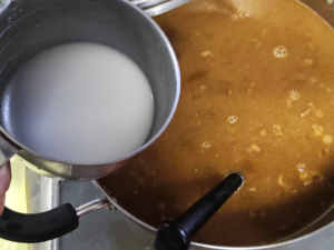 ![]() ⑥さらにとろみをつけるために、分量の水で溶いた片栗粉を加えて混ぜます。 (この時火を止めて行わないと、変に固まるので注意してください。) |