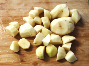 ![]() ②じゃがいもは皮をむいて、小さめの一口大に切りましょう。 |