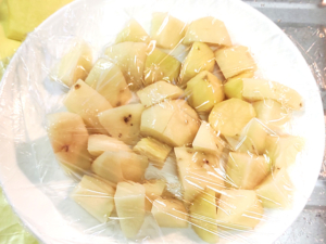 ![]() ③耐熱皿にじゃがいもを並べ、ラップをして、レンジで8~10分加熱します。 |
