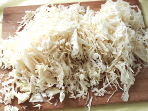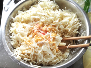 ![]() ④キャベツの千切り、水をボールに加え、全体が混ざるようにしっかり目に混ぜます。 |
