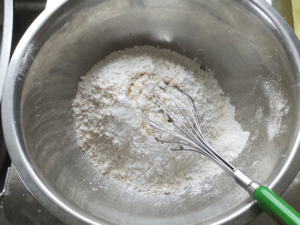 ![]() ②大きめのボールに、薄力粉、上新粉、ベーキングパウダーを入れ、泡立て器で混ぜ合わせます。 |