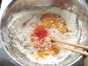 ![]() ③卵と天かす、紅生姜もボールに加え、卵を溶きましょう。 |