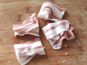 ![]() ⑤豚バラ肉は、長さを4等分します。 |