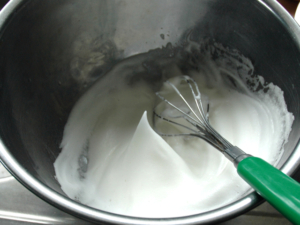 ①卵白に砂糖をひとつまみ加えて泡立て始め、クリームくらいの硬さになったら、残りの砂糖を二回に分けて加え、ピンと角が立つまで泡立てます。