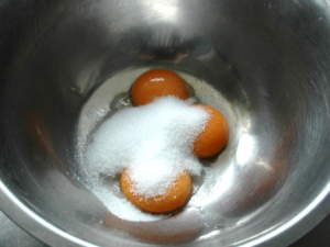 ②卵黄のボールに卵黄用の砂糖を全量加え、もったりとして白くなるまで泡立てましょう。