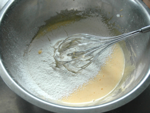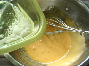 ③牛乳とサラダ油を一緒にレンジで20秒ほど温め、卵黄のボールに少量ずつ加え、その都度良く混ぜ合わせます。