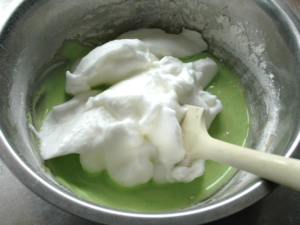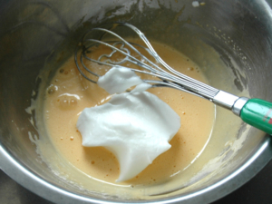 ④卵黄のボールにメレンゲをひとすくい加えて、良く混ぜましょう。