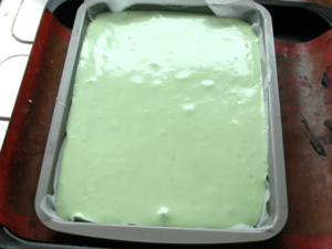 ⑧ケーキ型に生地を流し入れ、上からトントン落とし、大きな気泡を取り除きましょう。