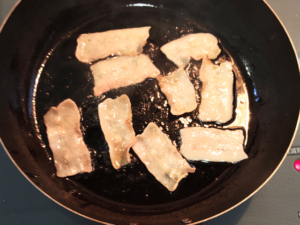 ②フライパンに薄く油(分量外)を引き、豚肉が重ならないように並べ、焼けたら、次の肉を焼きます。