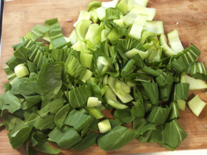 ④チンゲンサイは根元を落とし、小さめに刻みます。