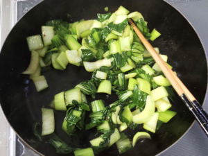 ⑤フライパンにチンゲンサイと酒、塩を入れて、強火で1~2分炒め、チンゲンサイがしなっとしたら取り出しましょう。