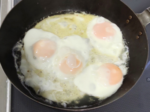 ⑥同じフライパンで、目玉焼きを人数分作ります。