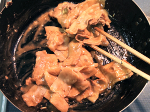⑧フライパンを再度加熱し、焼いた肉を加え、全体に味が絡んだらOK。