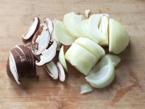 ![]() ①玉ねぎは皮をむき薄切りに、椎茸は軸を取り薄切りにします。 |