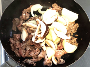 ![]() ④玉ねぎと椎茸も加え、玉ねぎが半透明になるまで炒めましょう。 |