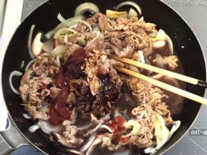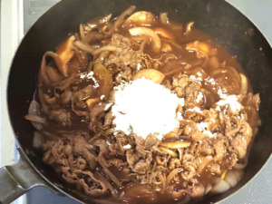 ![]() ③牛こま肉をフライパンに加え、肉が軽く白くなるまで炒めます。 |