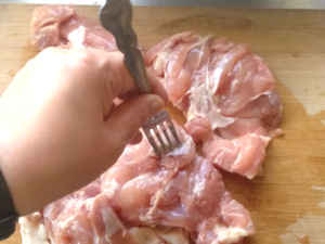 ![]() ①鶏肉は味がしみやすいように、身側にフォークで数か所穴をあけます。 |