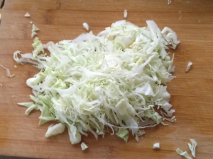 ![]() ⑥器にキャベツと盛りつけ、あればみじん切りにしたネギを散らします。 ⑦完成です。 |