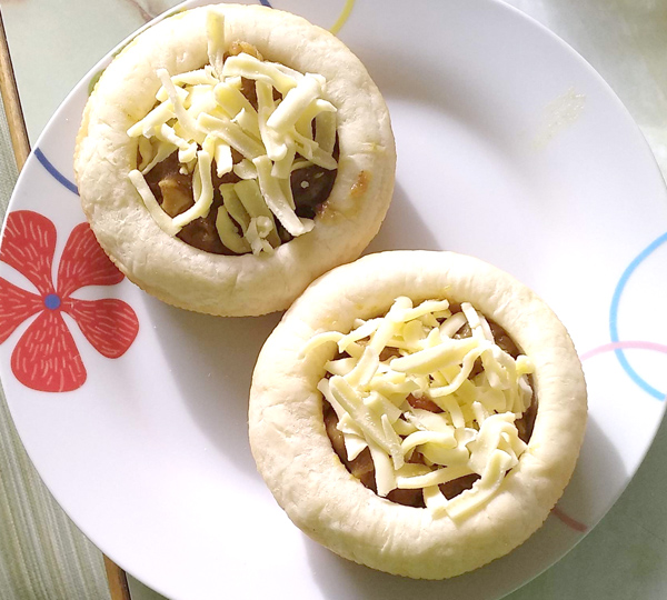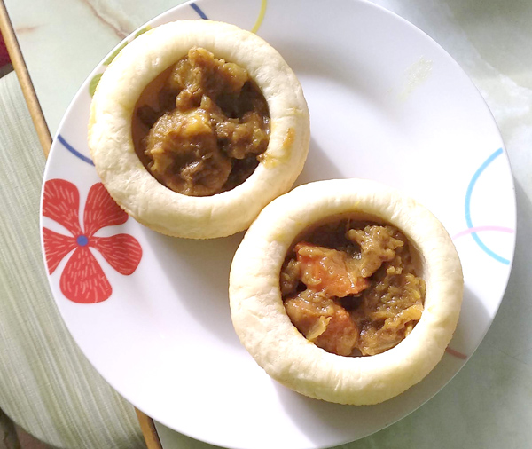 ![]() ②残り物のカレーを軽く温めなおして、カップパンに詰めます。 |