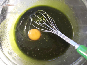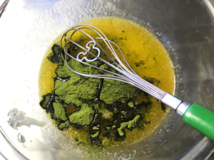 ![]() ①耐熱ボールにバターを入れ、レンジに2分程かけて、完全に溶かします。 (ふつふつと泡立つくらいまで強めに加熱します。) ②バターが熱いうちに、抹茶を加えて手早く混ぜましょう。 |