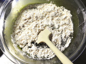 ![]() ⑤薄力粉とベーキングパウダーを合わせてふるい入れ、ゴムベラに持ち替えてさっくりと練らないように混ぜます。 |